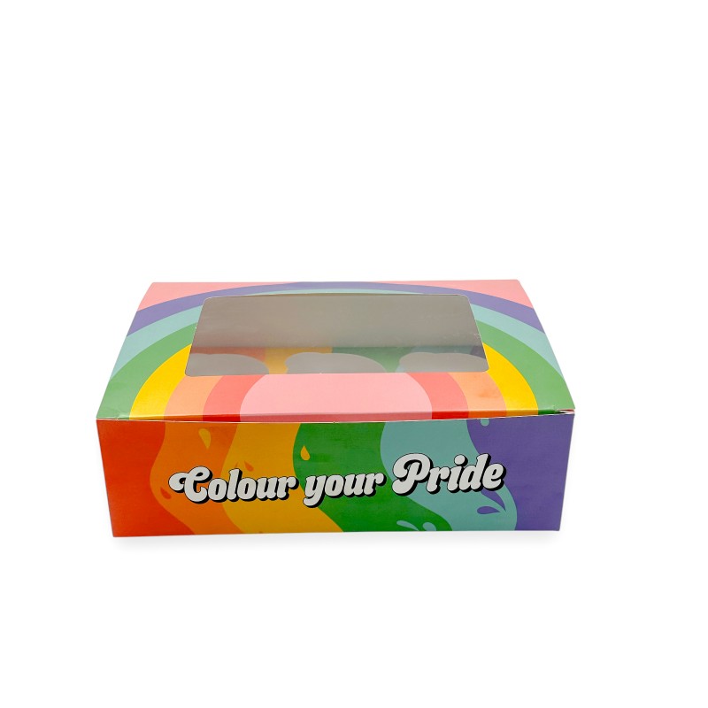 Doosje voor 6 cupcakes van Pastry Colours Love is Love – Colour your Pride. Dit doosje heeft een venster en een houder zodat je cupcakes of muffins goed stevig in het doosje staan.